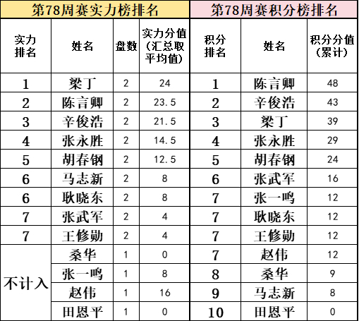 10 月 25 日,乐弈场第 78 场周赛准时开赛!围棋好手都聚一堂,各轮对弈精彩纷呈、悬念拉满,尽显棋艺交锋的魔力。流程多轮酣战,梁丁凭借深厚棋力与肃穆发达崭露头角,将“实力榜冠军”荣誉收入囊中;而陈言卿则赢得“积分榜”冠军。这场赛事既是棋艺的比拼,亦然棋手们以棋会友的同样盛宴。